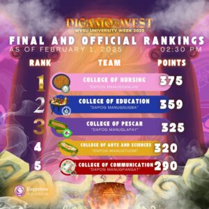 Next in the rankings, Dapog Manugtuom (College of Arts and Sciences) secured fourth place with 320 points, while Dapog Manugpangat (College of Communication) rounded out the top five with 290 points.