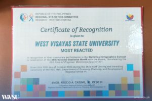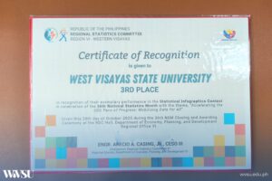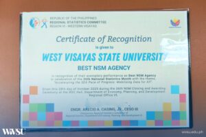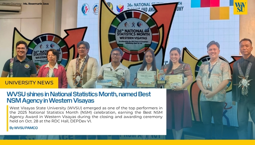 West Visayas State University (WVSU) emerged as one of the top performers in the 2025 National Statistics Month (NSM) celebration, earning the Best NSM Agency Award in Western Visayas during the closing and awarding ceremony held on Oct. 28 at the RDC Hall, DEPDev VI.