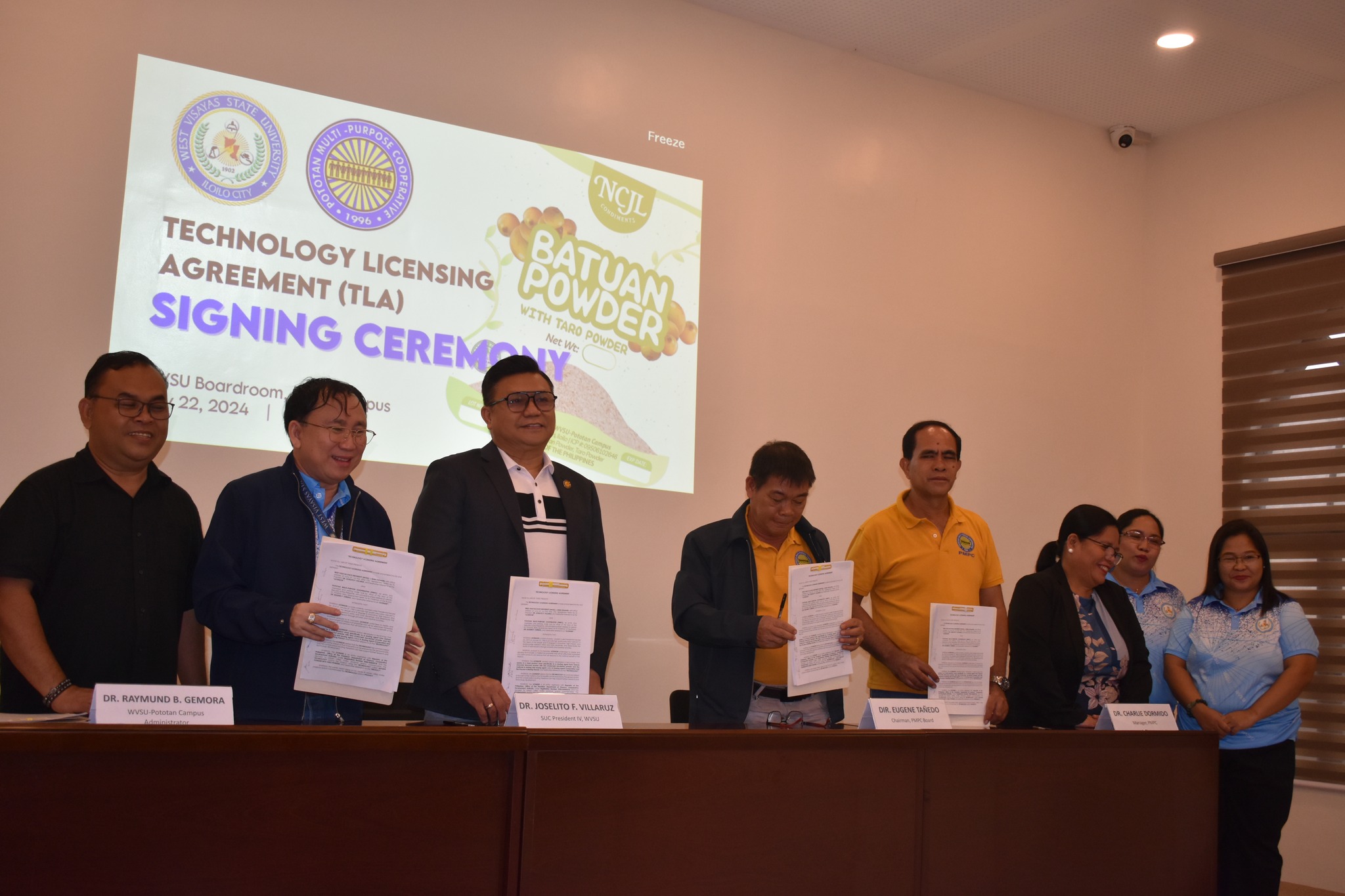 On behalf of West Visayas State university (WVSU), Dr. Joselito Villaruz has signed a Technical Licensing Agreement with the Pototan Multi-Purpose Cooperative to commercialize a novel souring agent made from batuan and taro powder, a technology developed by WVSU. Held on July 22, 2024 at the WVSU Board Room, Dr. Raymund Gemora, Campus Administrator, represented WVSU Pototan Campus, while Pototan Multi-Purpose Cooperative was represented by Dr. Eugene Tañedo, Chairman, and Dr. Charlie Dormindo, Manager.